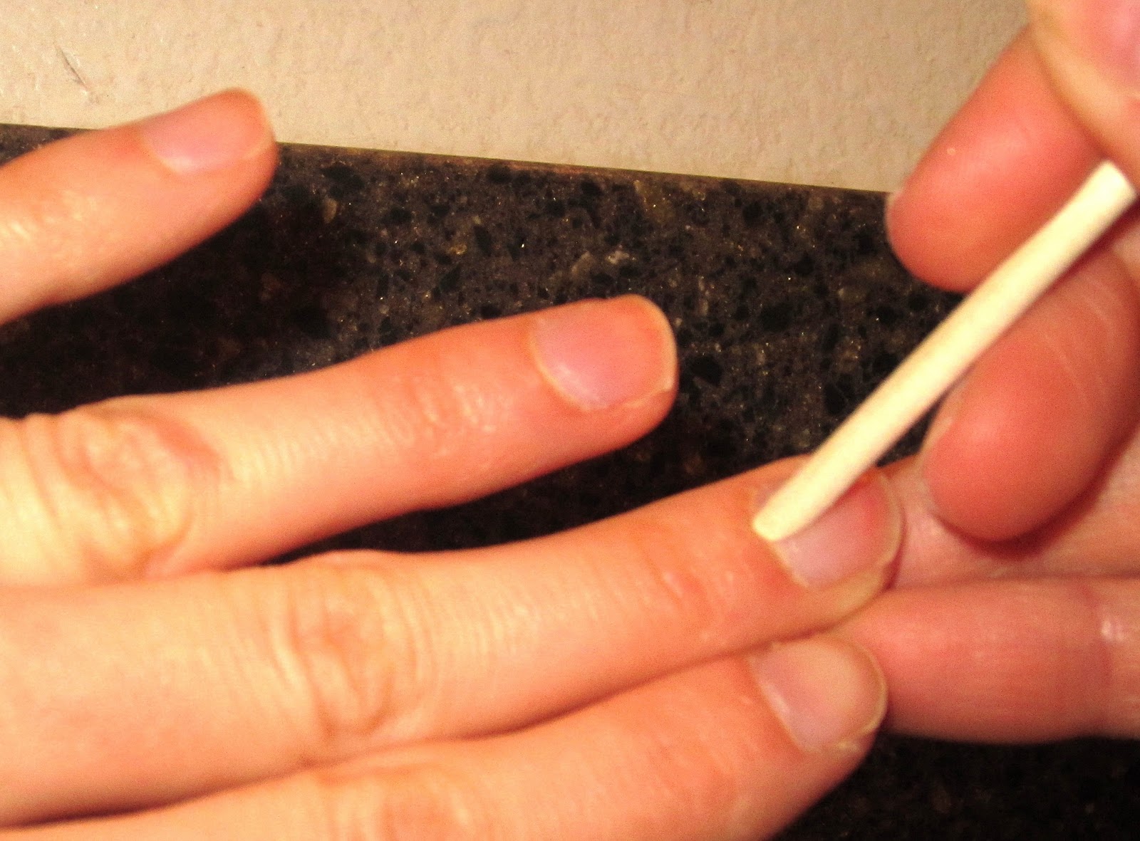To apply nail strips: First you need to prep your nails. Push back cuticles with the wooden stick.